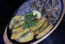 225/120/35/10 г • уши свиные с грудинкой в сливочно-грибном соусе с запеченным картофелем и томатом