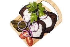 60/60/50 г • смалец с чесноком на гренках из ржаного хлеба, свежий томат, маринованный огурец зелень, красный лук